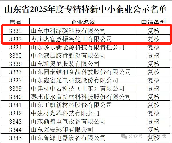 近日,山東省工信廳公布2025 年度專精特新中小企業(yè)名單,山東中科綠碳公司、棗莊杰富意公司順利通過復(fù)核。